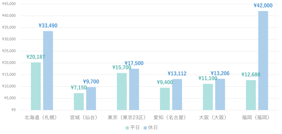 • 東京や大阪のにおける平日と休日の価格差は、それほど大きくありません。これは引き続きインバウンド旅行者の影響により、平日の価格が高まっているためです。
