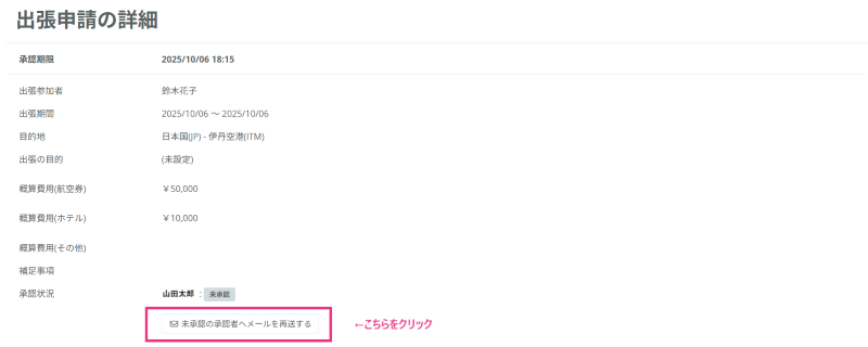 (2)画面中央に「承認状況」の記載がありその下あたりに「未承認の承認者へ承認メールを再送する」をクリック