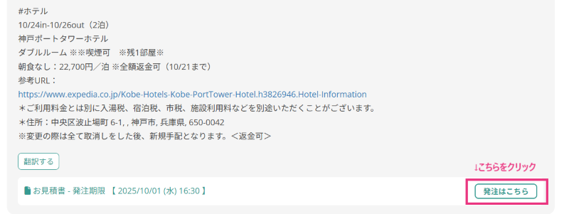 BORDERのご予約は「チャットで手配依頼」「ご自身で検索予約」のどちらのご依頼方法も「見積書の発注」が必要です。見積書の発注をすると実際の請求が発生いたします。