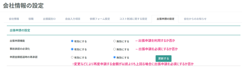 ・「出張申請機能」「事前承認の必須化」「申請金額超過時の再承認」の有効・無効を選択